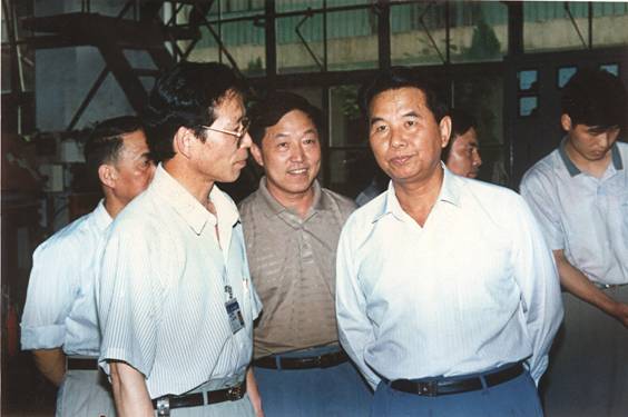 5、1997年4月16日,時(shí)任江西省省長(zhǎng)舒惠國(guó)(右)在市委書記、市長(zhǎng)丁耀民的陪同下來(lái)廠調(diào)研
