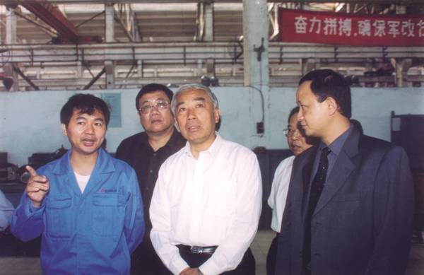 7、2001年4月11日,時(shí)任國(guó)防科工委主任劉積斌(前排左4)在省國(guó)防工辦主任李賢書的陪同下來(lái)廠調(diào)研