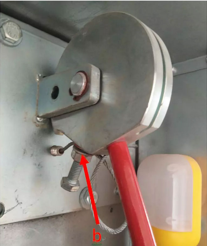 4.2)把軟軸用砂輪機(jī)從紅色箭頭a處割斷。 ![]() 4.4)參照下圖松開固定鋼絲繩的螺母,拆下控制柜一側(cè)的鋼絲繩,注意破損的鋼絲繩碎塊不要掉到控制柜里去,以免引起短路。 ![]() 4.5)抽出鋼絲繩后軟軸也就自然掉下來了,將鋼絲繩和軟軸拿到廳門外面,轉(zhuǎn)入下一工序。