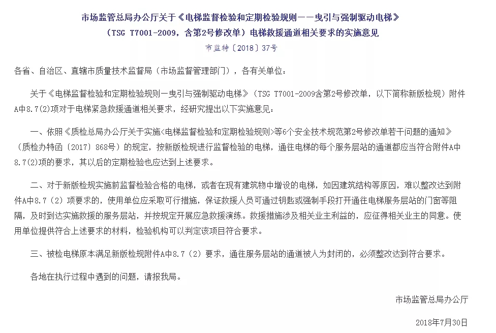 問(wèn):GB 28621-2012《安裝于現(xiàn)有建筑物中的新電梯制造與安裝安全規(guī)范》為何不能執(zhí)行? 總局:納入特種設(shè)備安全監(jiān)管的電梯應(yīng)依據(jù)《電梯監(jiān)督檢驗(yàn)和定期檢驗(yàn)規(guī)則》進(jìn)行監(jiān)督檢驗(yàn)。 問(wèn):消防員電梯條款疑問(wèn) 總局回復(fù):請(qǐng)按照檢規(guī)要求執(zhí)行。 問(wèn):私人將電梯層門(mén)改為直接入戶該如何處理? 還有房屋內(nèi)的電梯在監(jiān)督檢驗(yàn)時(shí)滿足應(yīng)急救援通道要求,但在監(jiān)檢合格之后,私人更改原規(guī)劃設(shè)計(jì),將某層或多層電梯層門(mén)改為直接入戶,請(qǐng)問(wèn)這種情況在年度檢驗(yàn)中如何處理? 總局回復(fù):“市場(chǎng)監(jiān)管總局辦公廳關(guān)于《電梯監(jiān)督檢驗(yàn)和 定期檢驗(yàn)規(guī)則——曳引與強(qiáng)制驅(qū)動(dòng)電梯》 (TSG T7001-2009,含第2號(hào)修改單)電梯救援通道相關(guān)要求的實(shí)施意見(jiàn)”(市監(jiān)特〔2018〕37號(hào))已明確相關(guān)要求。