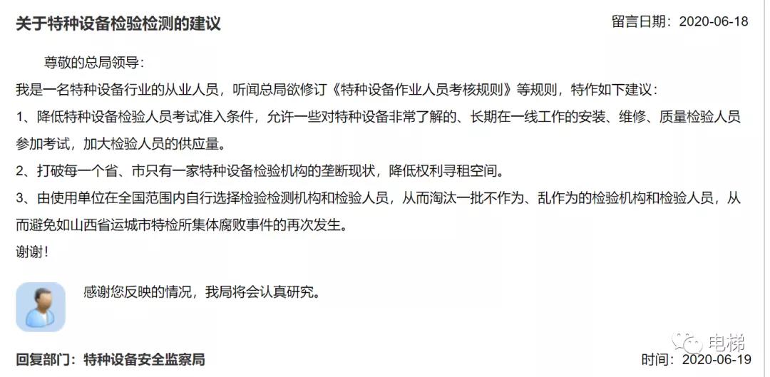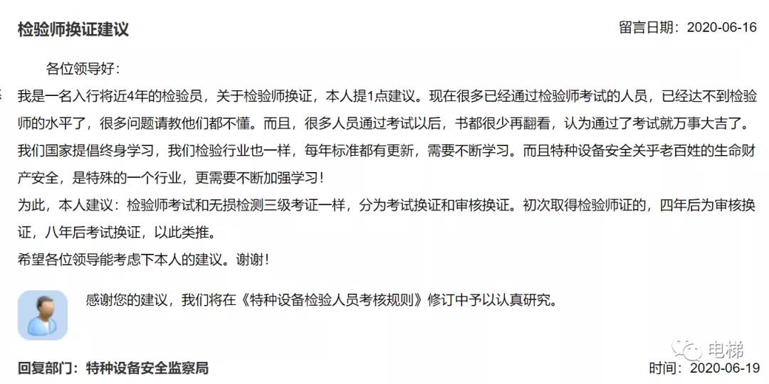 總局回復:感謝您的建議,我們將在《特種設備檢驗人員考核規(guī)則》修訂中予以認真研究。