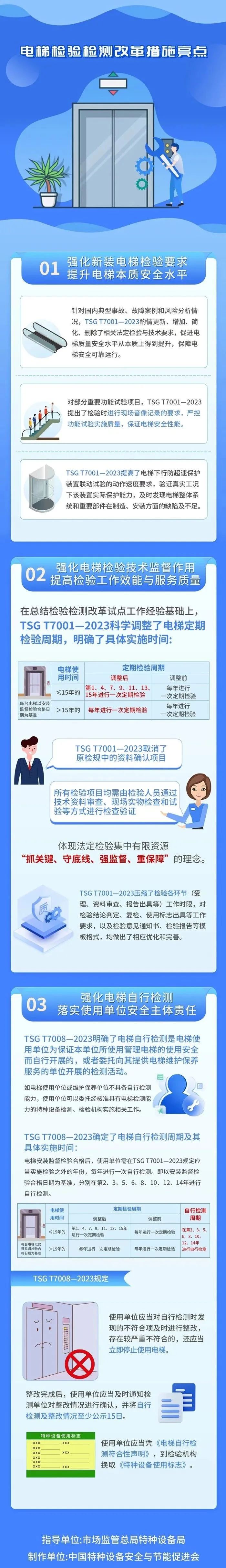 為著力提升電梯質(zhì)量安全水平,不斷滿(mǎn)足人民群眾日益提高的安全、便利乘梯需求,將電梯檢驗(yàn)檢測(cè)改革成果制度化、長(zhǎng)效化,市場(chǎng)監(jiān)管總局于2023年4月2日以2023年第14號(hào)公告發(fā)布《電梯監(jiān)督檢驗(yàn)和定期檢驗(yàn)規(guī)則》(TSG T7001—2023)和《電梯自行檢測(cè)規(guī)則》(TSG T7008—2023)。兩個(gè)規(guī)則自發(fā)布之日起施行,過(guò)渡期為1年,2024年4月將進(jìn)入全面實(shí)施階段。遼寧、山西、上海、安徽、貴州、甘肅、青海、寧波等地將于2024年1月1日起按照兩個(gè)規(guī)則實(shí)施電梯定期檢驗(yàn)和自行檢測(cè)工作。