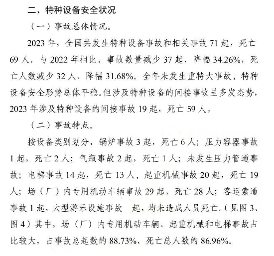 截止2023年底(下同),全國特種設(shè)備總量達(dá)2128.91萬臺。其中:鍋爐31.96萬臺、壓力容器533.92萬臺、電梯1062.98萬臺、起重機械292.17萬臺、客運索道1135條、大型游樂設(shè)施2.52萬臺(套)、場(廠)內(nèi)專用機動車輛205.25萬臺。另有:氣瓶2.88億只、壓力管道99.13萬公里(在冊)。(見圖1)