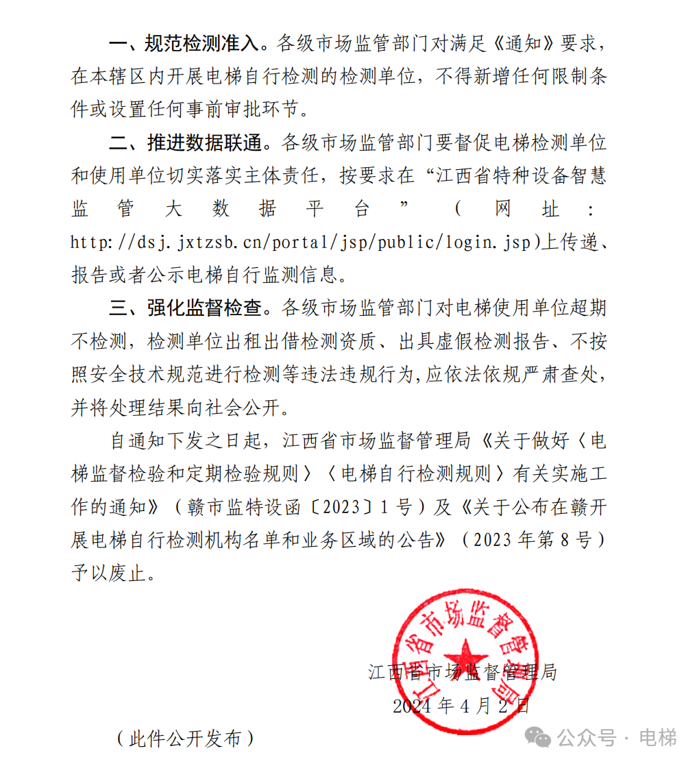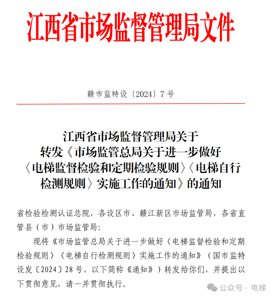 2024年4月2日,江西省市場(chǎng)監(jiān)督管理局下發(fā)了關(guān)于電梯新檢規(guī)和電梯檢測(cè)的文件。江西對(duì)國(guó)家市場(chǎng)監(jiān)督管理總局的文件落實(shí)的是目前全國(guó)最徹底的一個(gè),沒(méi)有增加什么條件,頓時(shí)引來(lái)了一批電梯檢測(cè)為其喝彩,為其點(diǎn)贊。